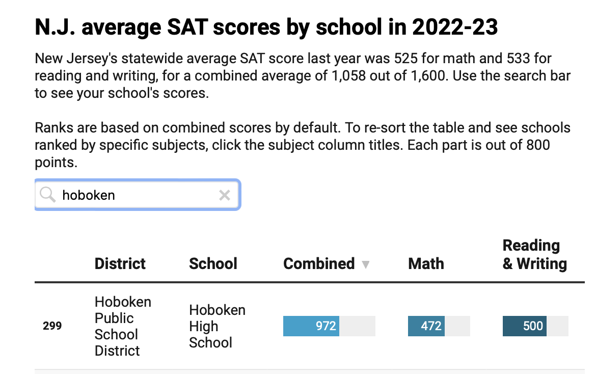 Newly released data for the 2022-23 school year shows Hoboken High School has a combined score of 972 with a 472 in Math and a 500 in Reading/Writing. Hoboken HS is ranked 299th in the state according to NJ.COM. Hoboken High School’s 2022-23 SAT scores are below average for its “FG” District Factor Group.